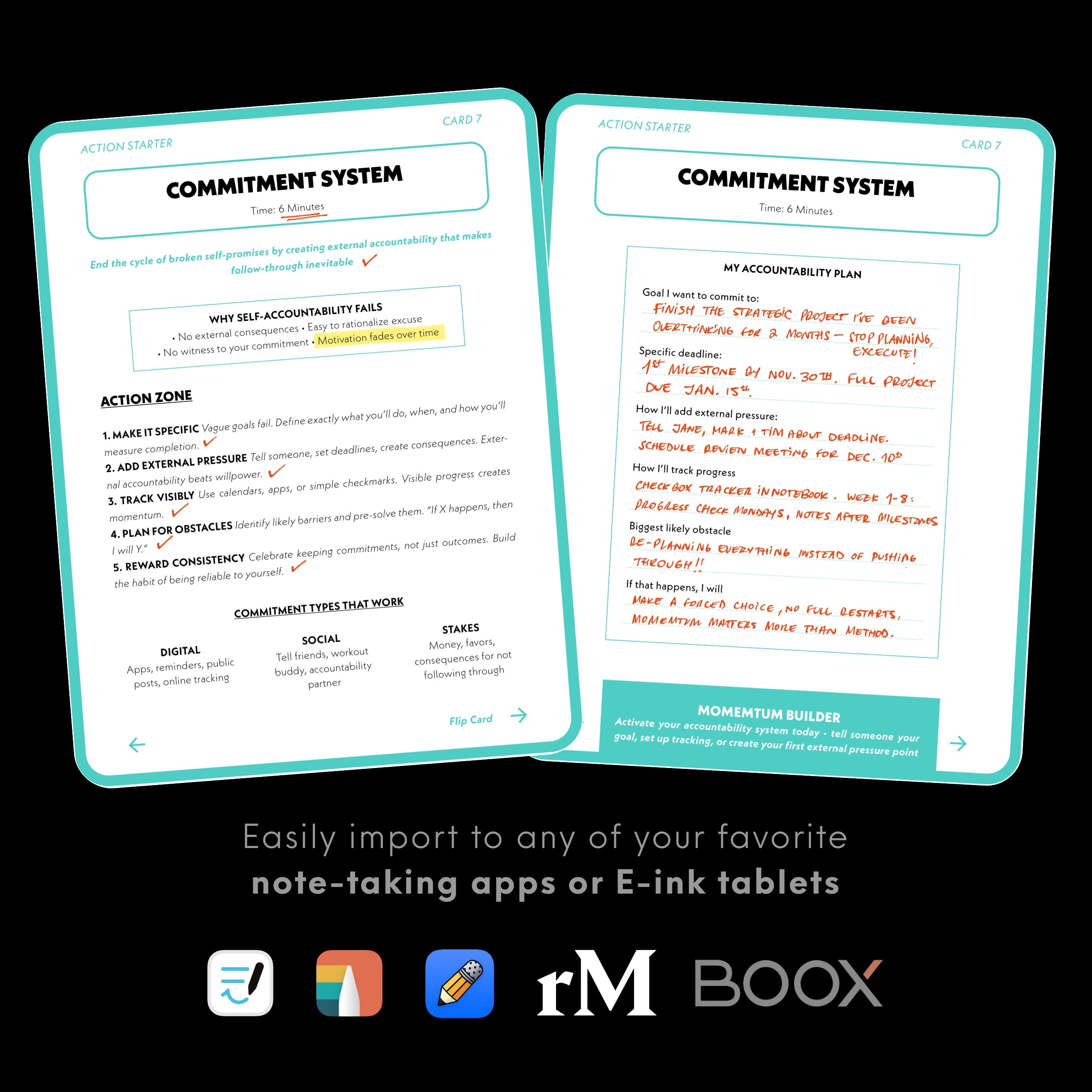 The cards are formatted as 5" x 7" PDFs optimized for e-ink tablets like reMarkable, but they'll work on any device that can display PDFs—including iPads, standard tablets, computers, or even printed on paper. For the best experience, we recommend using the digital cards with note-taking apps like Goodnotes, Notability, or Xodo. They're available in most app stores and are user-friendly.